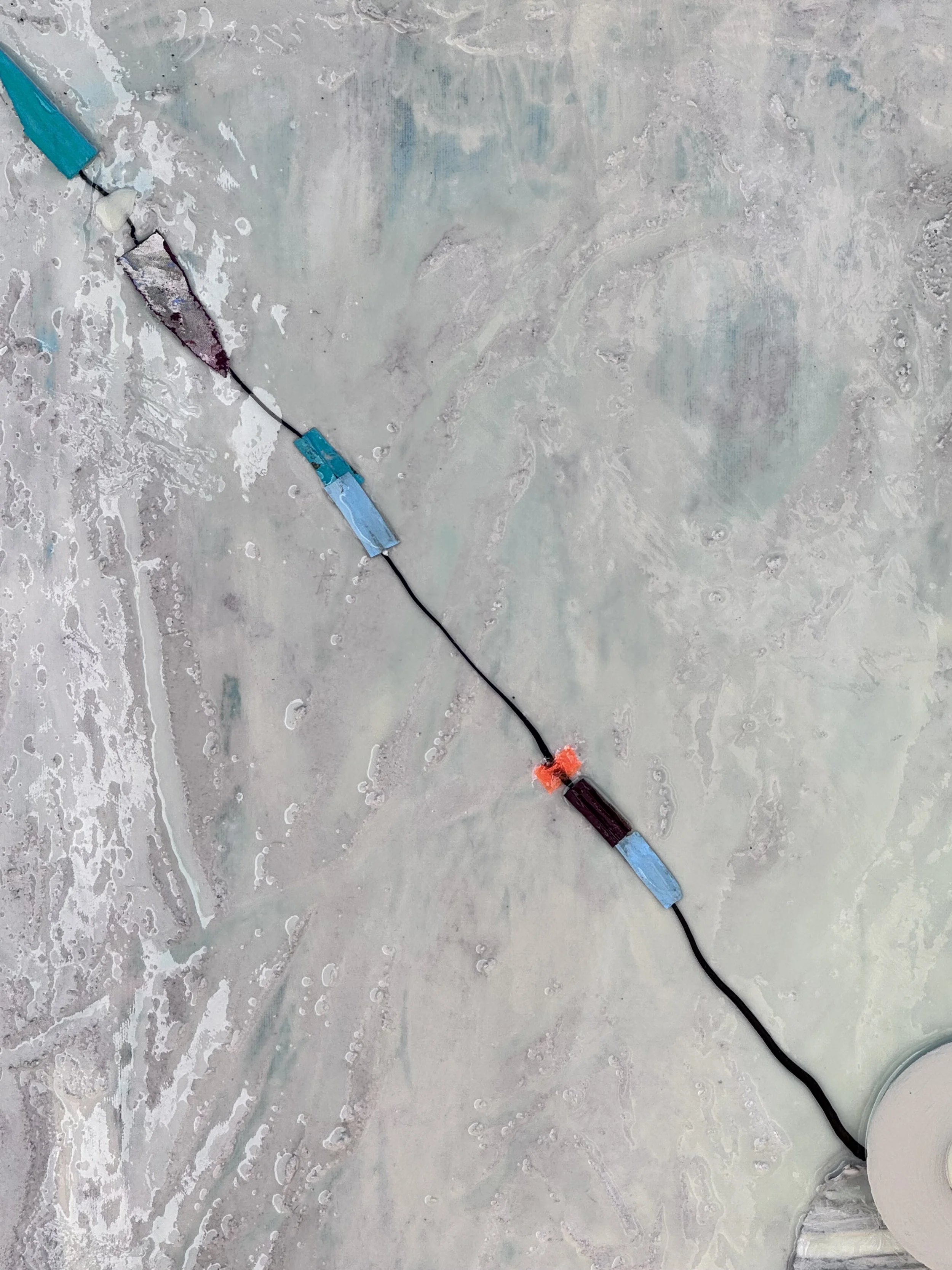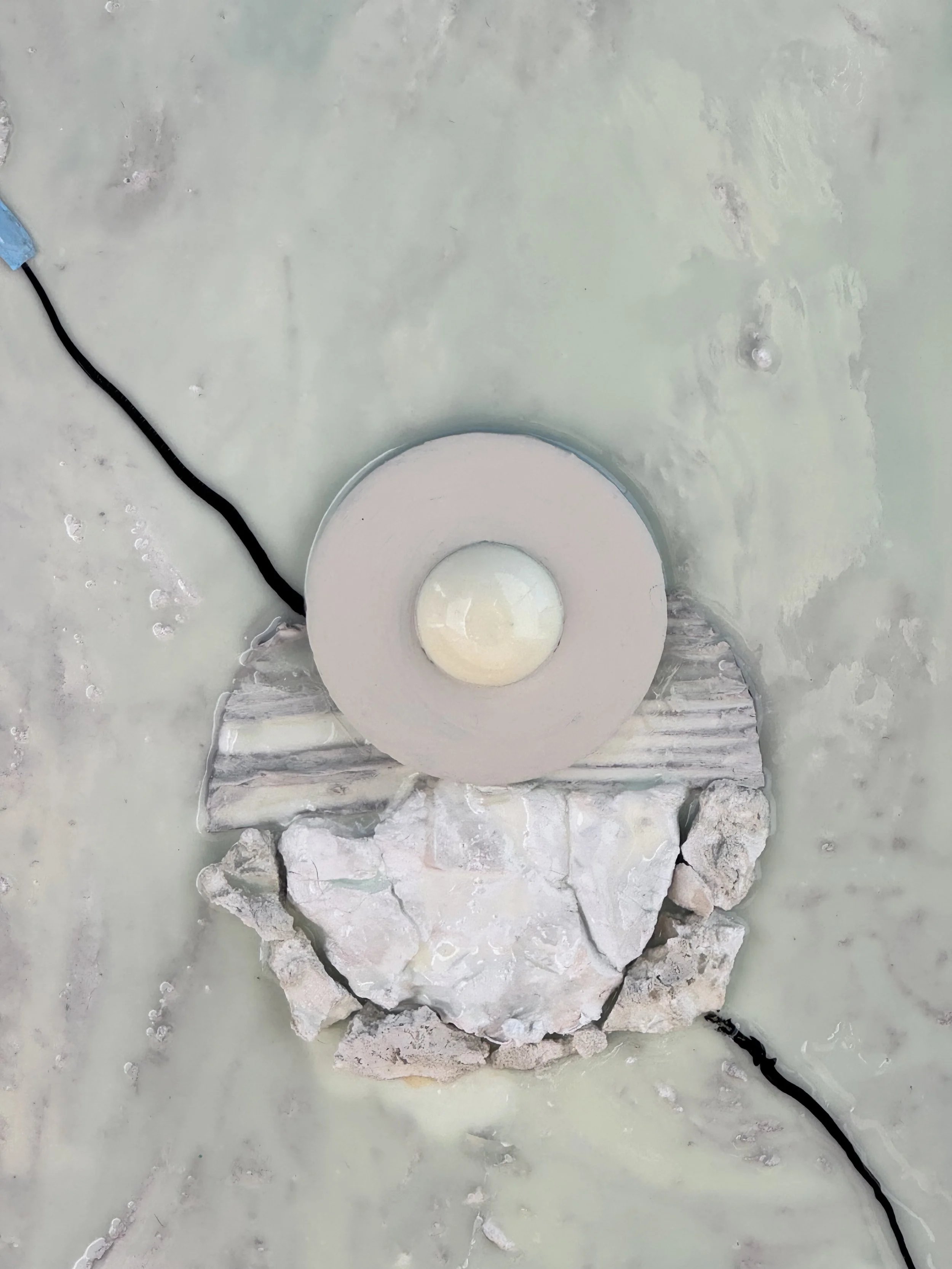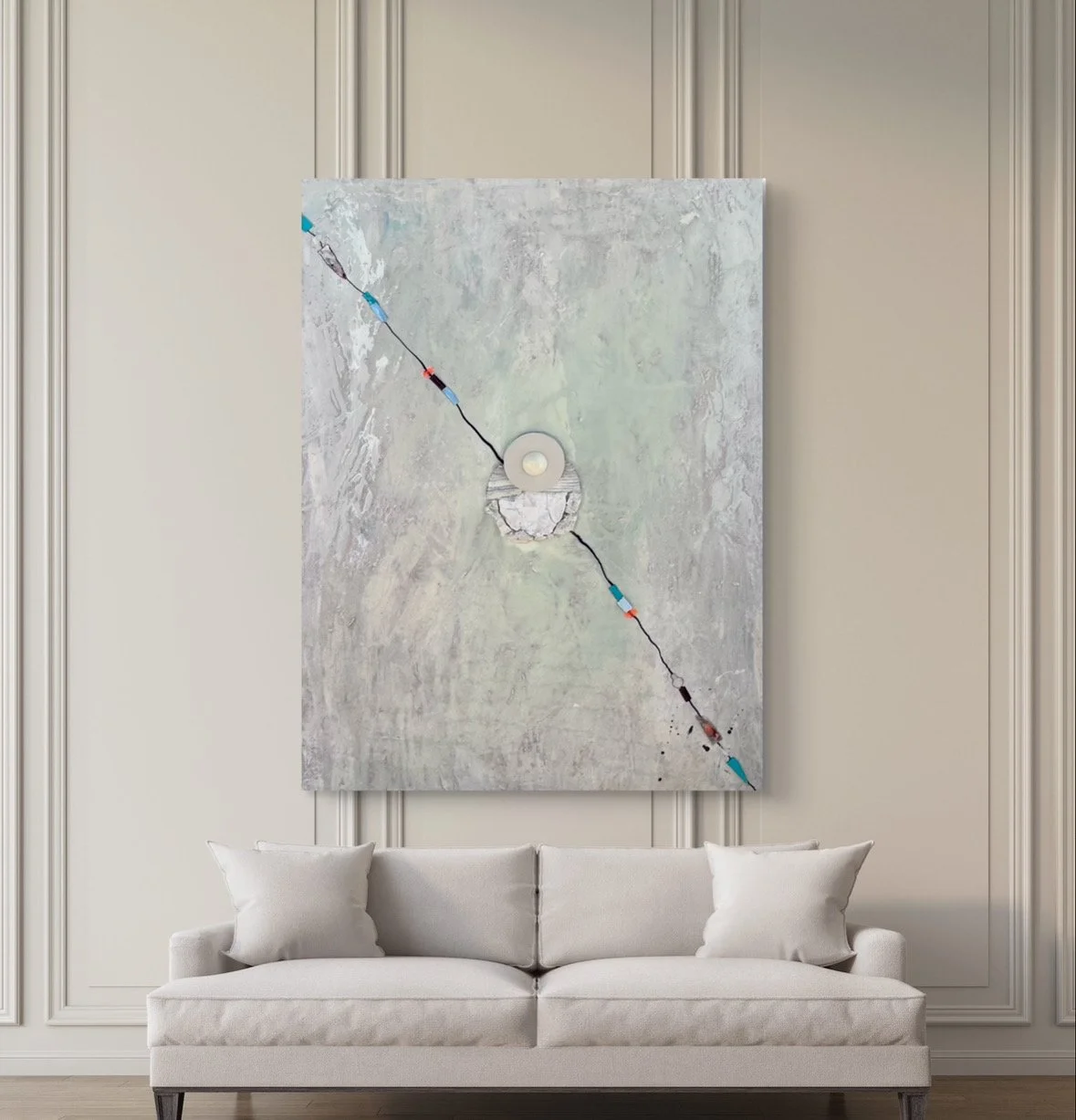Paradise is a mixed-media work measuring 100 x 130 cm. The piece features multiple layers of texture, acrylic paint, resin, and a central composition made of diverse materials that extend from edge to edge, evoking the life line — with its milestones and moments that shape our journey. The result is a harmonious and powerful work that celebrates the beauty of life.