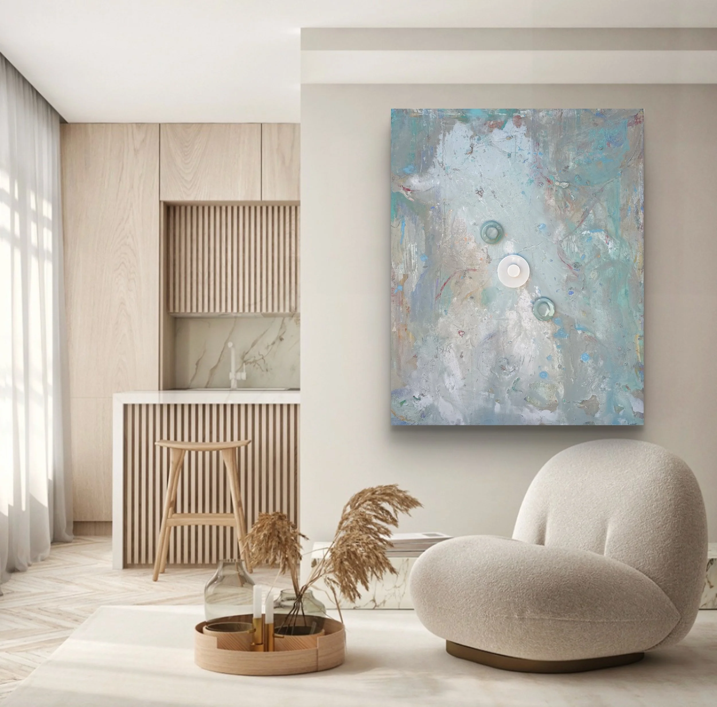 Mediterranean is a mixed-media piece measuring 81 x 100 cm, inspired by the sea’s ever-changing light and rhythm. Created with layers of acrylic, resin, and mineral textures, the work captures the feeling of calm depth beneath the surface. Shades of turquoise, sand, and misty white intertwine, evoking the fluid balance between movement and stillness. Through its organic composition and luminous tones, Mediterranean becomes a reflection of serenity — a visual echo of the quiet, infinite dialogue between water and sky.